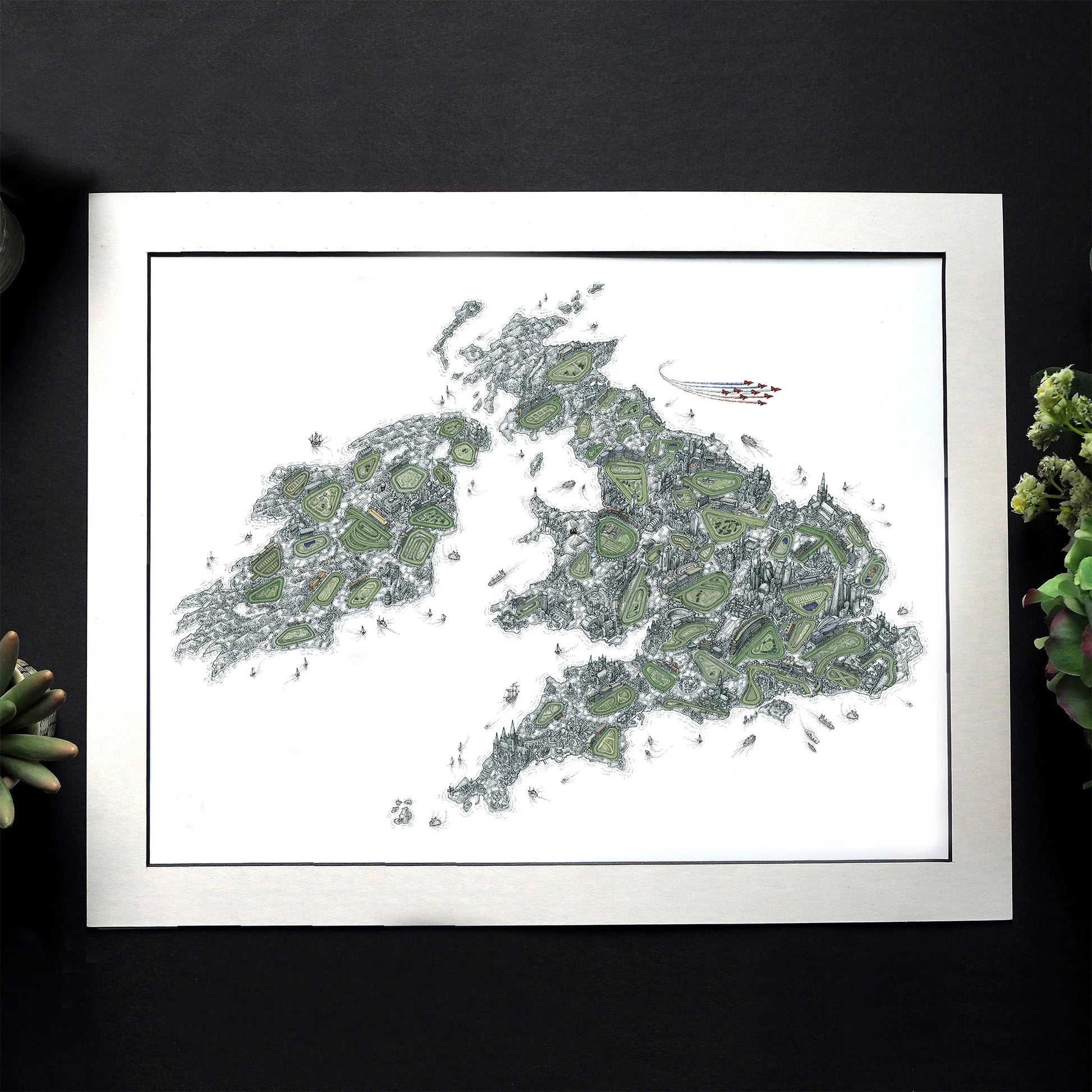 Experience the passion and prestige of British and Irish horse racing captured in Ben Staves' first equestrian themed sporting map. This artistic illustration of the British Isles showcases the 58 of the most celebrated racecourses across the UK and Ireland—from prestigious Royal Ascot and the historic Epsom Downs to the atmospheric Cheltenham Festival and Fairyhouse—each rendered with architectural precision!