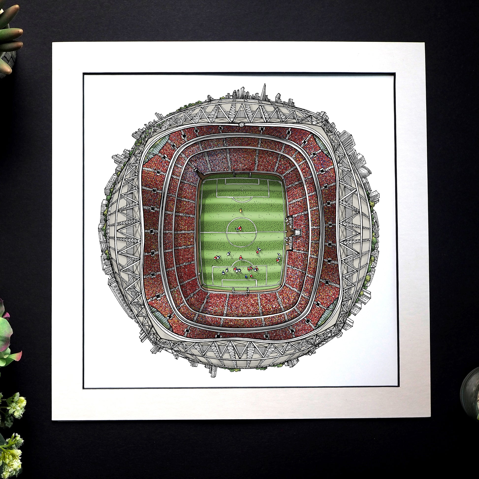 This visually stunning print offers an unusual perspective of Emirates Stadium - home of the Gunners - and the London cityscape.