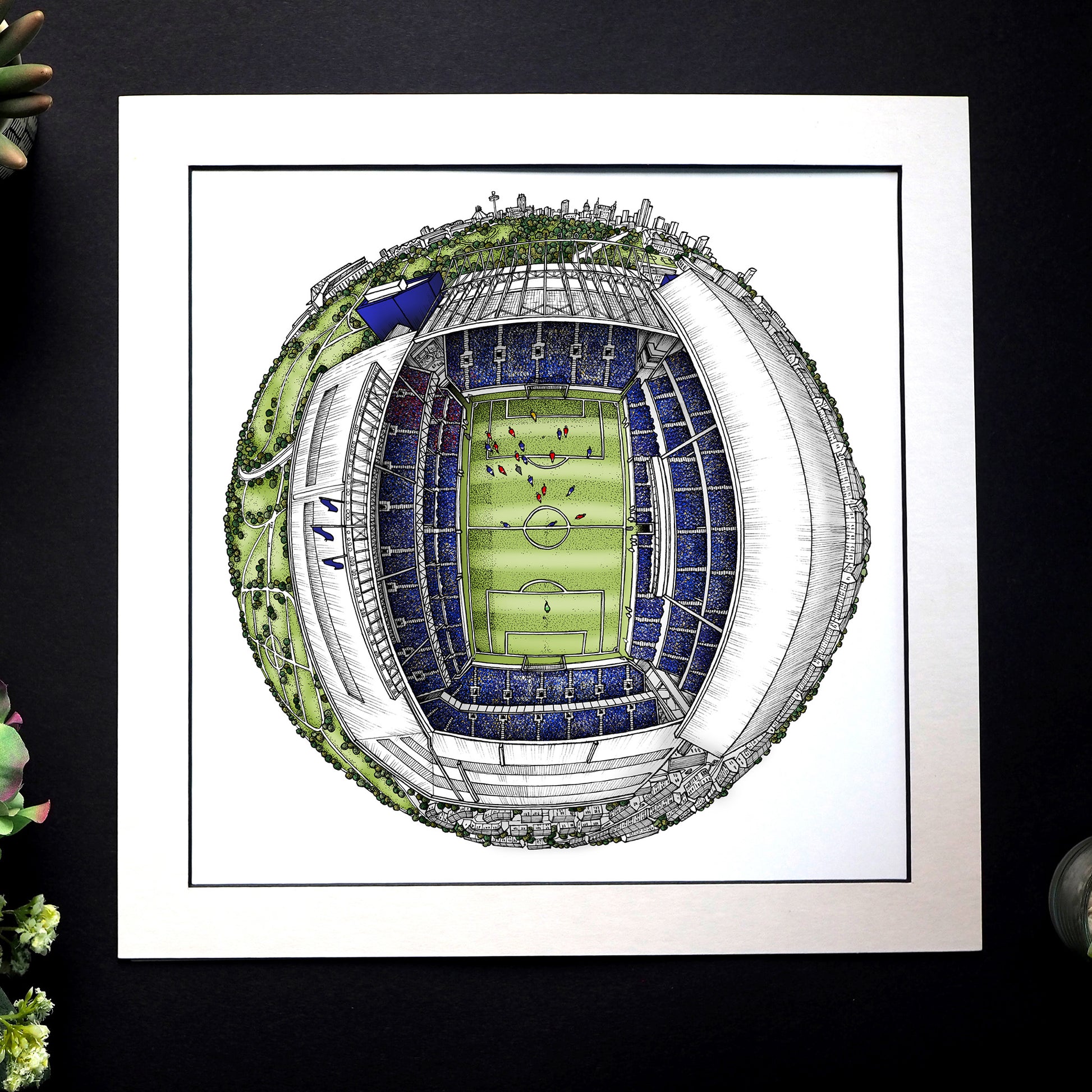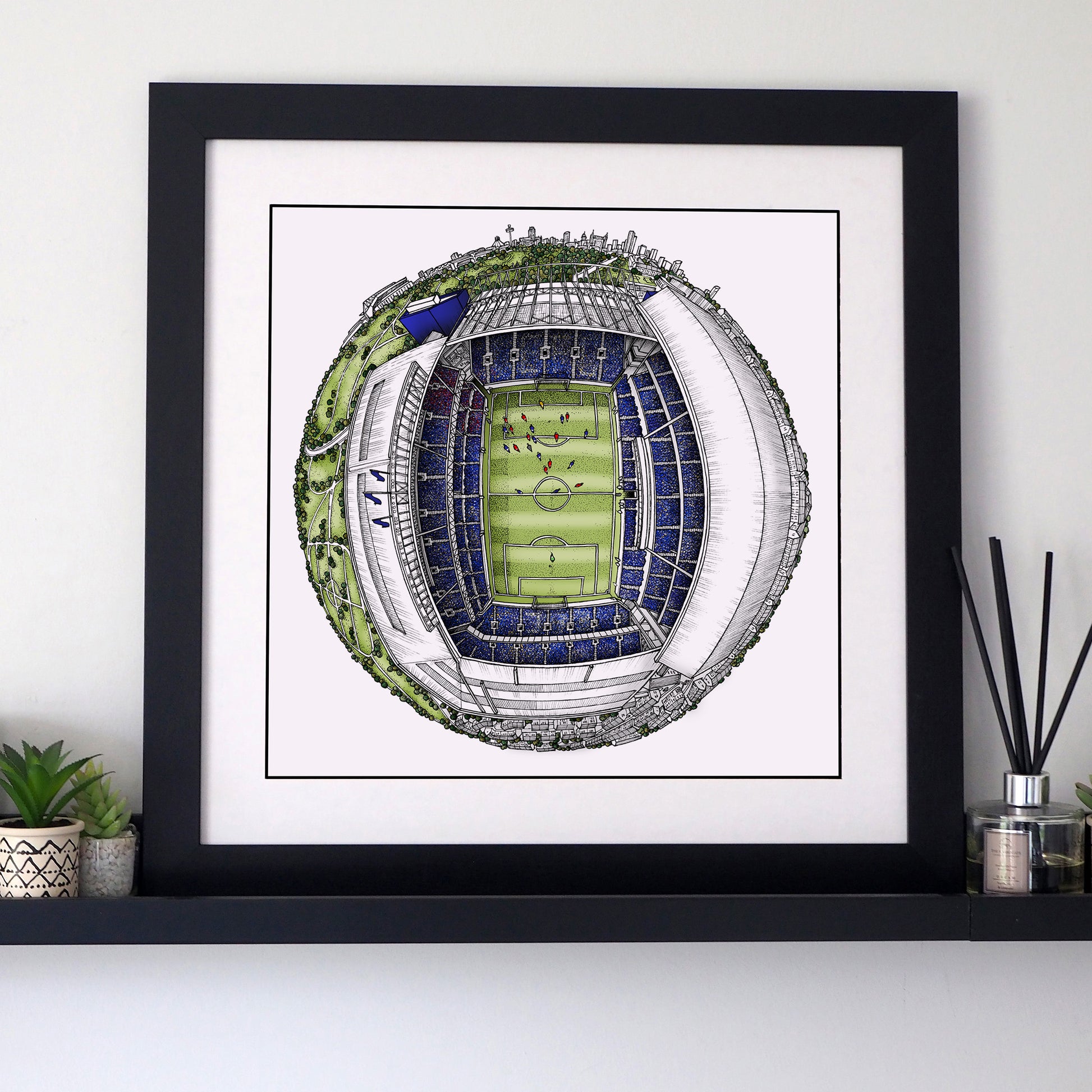 This visually stunning print offers an unusual perspective of Goodison Park and the Liverpool cityscape.
