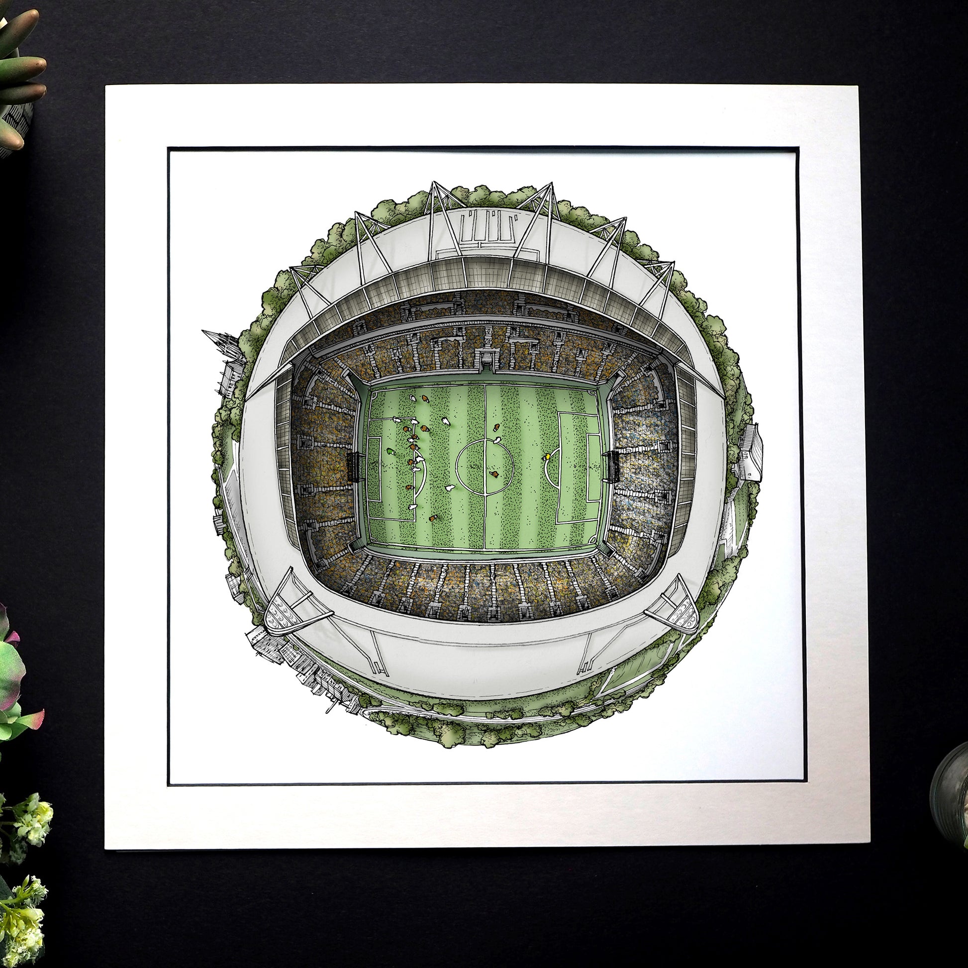 This visually stunning print offers an unusual perspective of the MKM Stadium and the Hull cityscape.