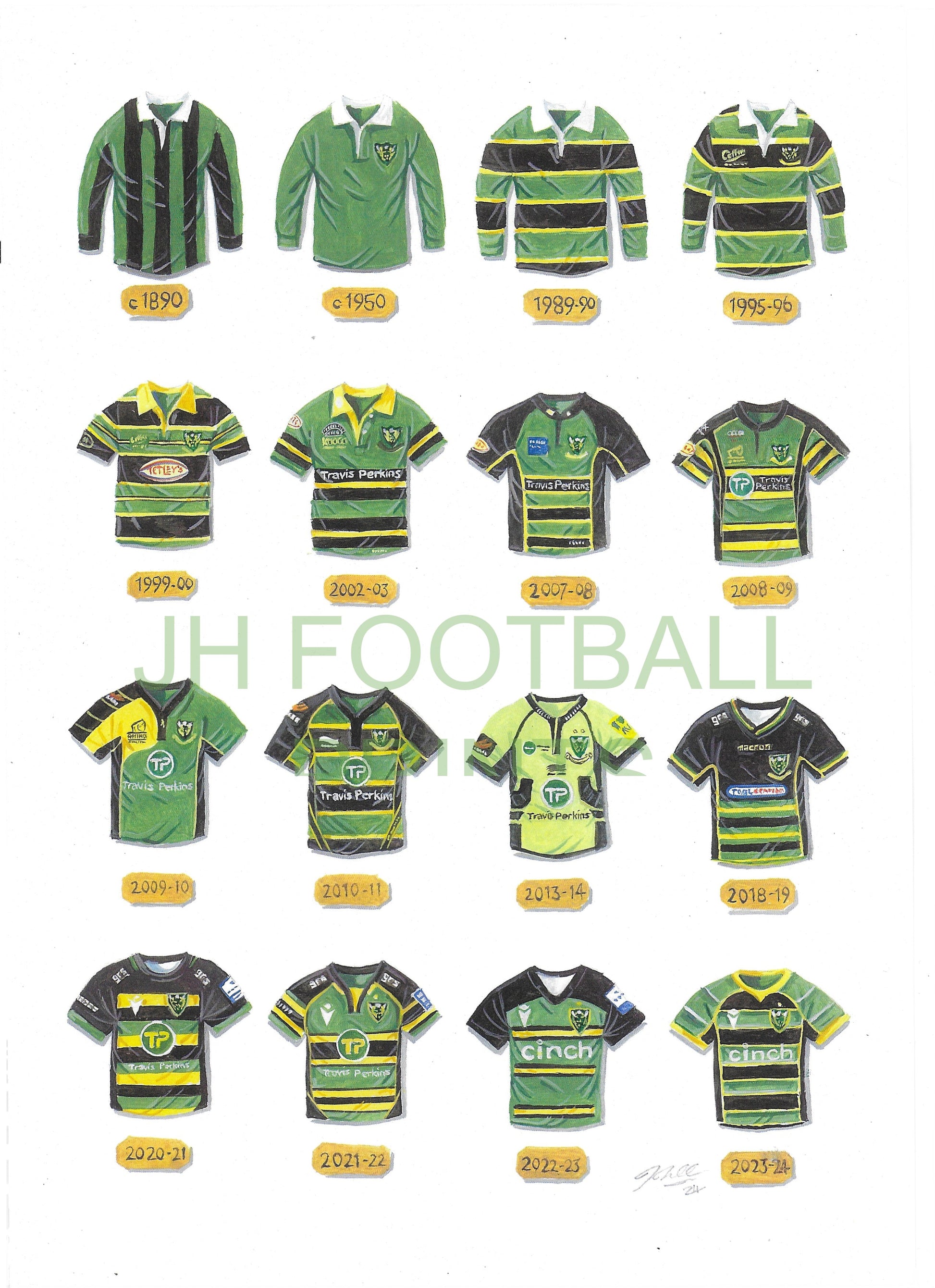 A stunning hand painted print showing a selection of iconic club shirts through the years.