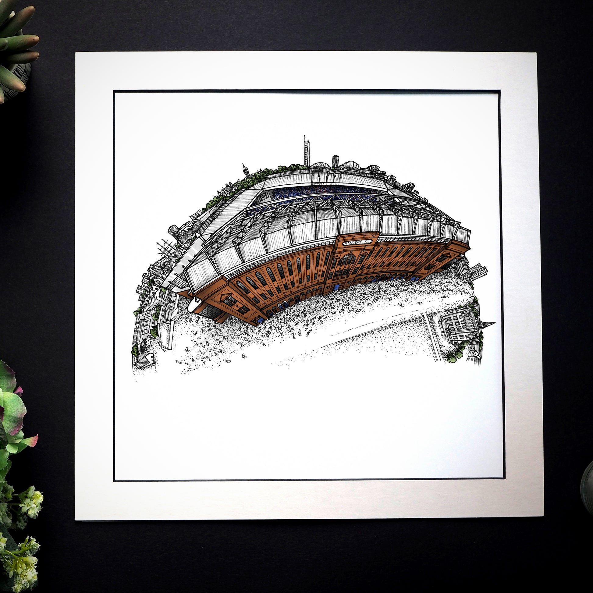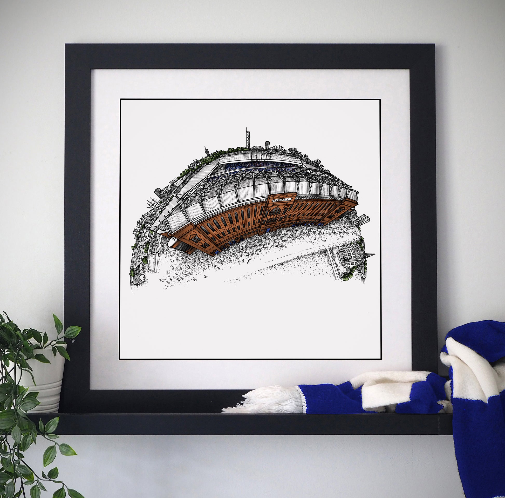 This visually stunning print offers an unusual perspective of Ibrox Stadium and the Glasgow cityscape.