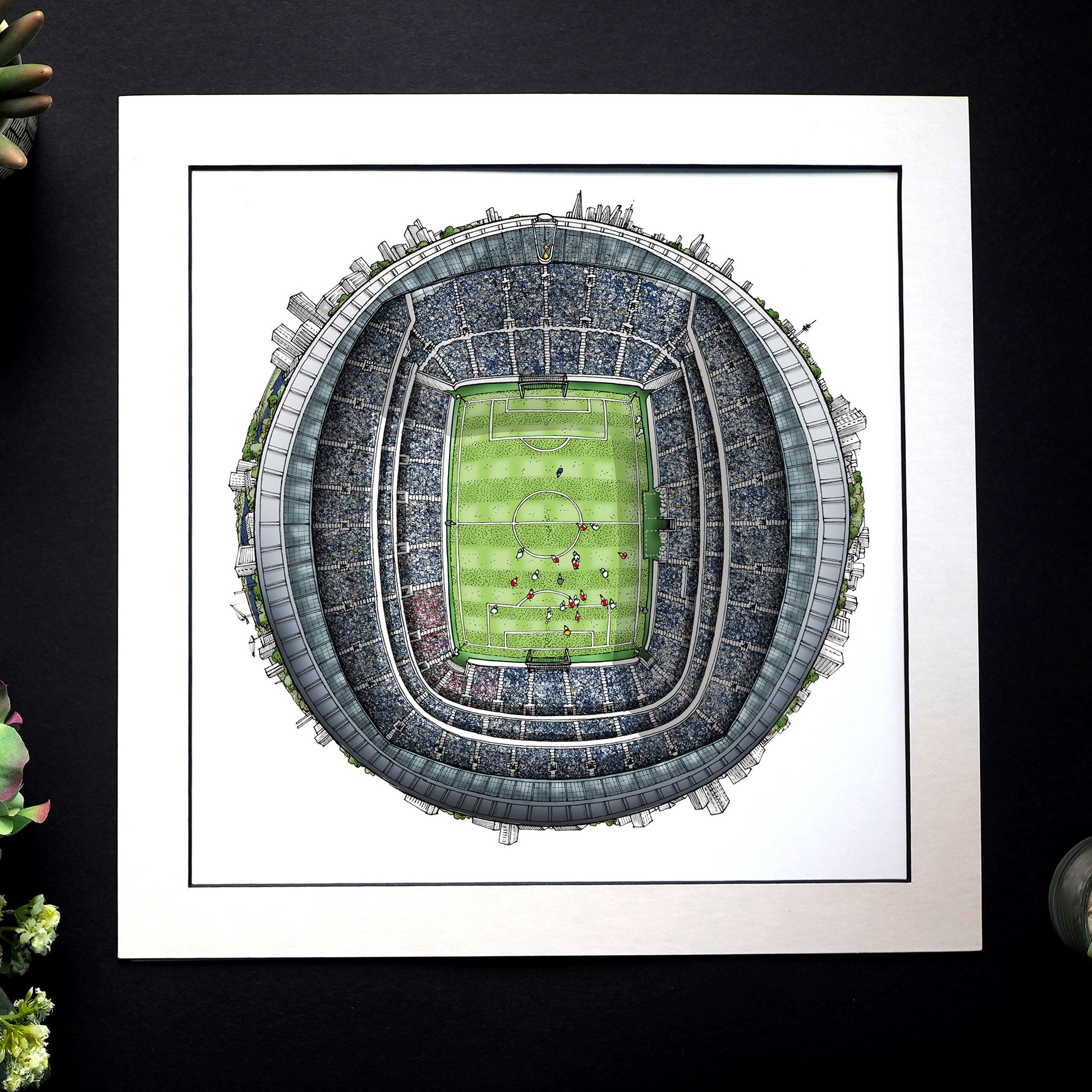 This visually stunning print offers an unusual perspective of The Tottenham Stadium and the London cityscape.