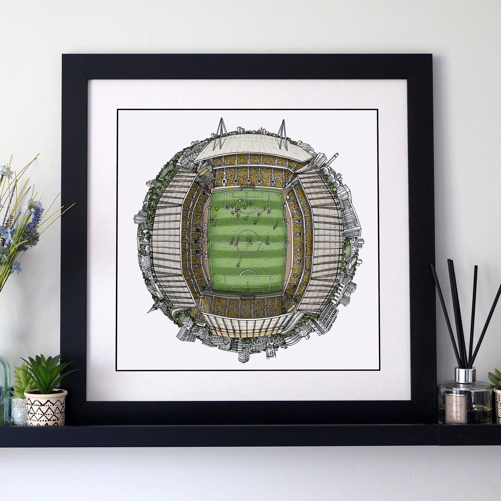 This visually stunning print offers an unusual perspective of Molineux Stadium and the Wolverhampton cityscape.